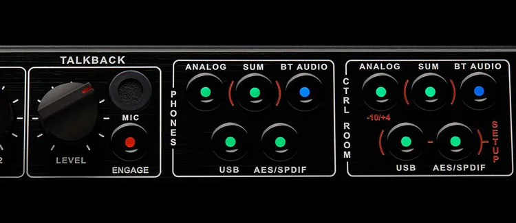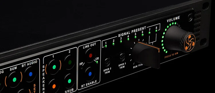 Like a large console’s center section, the D-BOX+ provides elaborate routing and switching of your studio’s inputs and outputs, both analog and digital. At the push of a button, you can select from five input sources: analog stereo, the onboard analog summing mixer, USB, AES/SPDIF and brand new for the D-BOX+, a wireless Bluetooth stream from any Bluetooth-enabled device. Outputs include three stereo speaker ports, and these can be programmed to be mono and/or to include a subwoofer. Further, you can use output 3 as source for an independent sub with individual level and mute control.